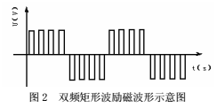 常規(guī)電磁流量計(jì)所應(yīng)用的低頻方波勵(lì)磁方式的勵(lì)磁電流頻率通常為工頻的1/4~1/10。目前深井(6000m以上)的固井施工中所使用泥漿的密度大多在1.8g/cm³以上,流速高達(dá)25m/s,所用的泥漿又是固液兩相低導(dǎo)率流體,雖然高壓下能消除非牛頓流體所帶來的測量誤差,但測量管內(nèi)會(huì)產(chǎn)生隨流量增加而頻率增加的隨機(jī)干擾噪聲。經(jīng)測定,在DN50測量管內(nèi),所用的泥漿密度為2.0g/cm³,流速在10~15m/s范圍內(nèi),測量管內(nèi)的流動(dòng)噪聲主要為尖峰狀的泥漿流噪聲,量級在mv級,頻率集中在25Hz以下,如圖1所示。在勵(lì)磁頻率較低時(shí),泥漿干擾的數(shù)量級較大,高頻時(shí)干擾數(shù)量級較小,具有1/f的頻譜特性。另外,施工現(xiàn)場敲擊和震動(dòng)所帶來的低頻噪聲,也會(huì)影響電磁流量計(jì)的計(jì)量精度。提高勵(lì)磁電流頻率可以規(guī)避和抑止這些干擾,以提高電磁流量傳感器輸出的信噪比,但會(huì)犧牲電磁流量計(jì)的零點(diǎn)穩(wěn)定性。本文提出新的一種勵(lì)磁方式,采用雙頻矩形波作為勵(lì)磁信號。其勵(lì)磁電流波形是在低頻矩形波上疊加高頻矩形波,用兩種采樣頻率分別得到高頻和低頻兩種流量信號。如圖2所示,高頻部分是80Hz的矩形波,外包絡(luò)線是10Hz的低頻矩形波。這樣,能克服單一低頻矩形波勵(lì)磁存在的泥漿流動(dòng)噪聲,同時(shí)又能保證零點(diǎn)的穩(wěn)定性,提高流量計(jì)的計(jì)量穩(wěn)定性和響應(yīng)速度。