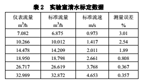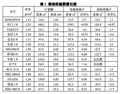 現(xiàn)場試驗(yàn)所用測量管的內(nèi)徑為DN50,通過高壓由壬接入泥漿管線,并串接渦輪流量計(jì)進(jìn)行比較,采用標(biāo)準(zhǔn)計(jì)量罐測試。計(jì)量鉆井泥漿密度范圍為1.15g/cm³~2.50g/cm³,固井設(shè)計(jì)施工現(xiàn)場一次性替漿量為18m³~160m³,替漿瞬時(shí)流量為0.2m³/min~2.8m³/min(流速:1.6~23.8m/s);通過近15口井的施工應(yīng)用,結(jié)果如表1所示。試驗(yàn)表明儀表計(jì)量誤差小于1%;在流速2.0m/s以下,隨著流量的減少測試誤差逐漸提高,在流速1.0m/s左右計(jì)量精度降到3%左右。經(jīng)分析,主要是由零點(diǎn)漂移引起的,這點(diǎn)與實(shí)驗(yàn)室用清水標(biāo)定結(jié)果基本吻合。使用DN50的測量管,實(shí)驗(yàn)室標(biāo)定結(jié)果如表2所示。試驗(yàn)證明,采用雙頻矩形波作為勵(lì)磁信號,可有效地規(guī)避和抑止固井泥漿的流動(dòng)噪聲和現(xiàn)場震動(dòng)等所帶來的低頻噪聲,從而顯著提高儀表計(jì)量泥漿的精度。