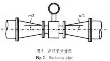 (12)當管道內(nèi)流速偏低,工藝流量又較穩(wěn)定,為滿足儀表對流速范圍的要求,在儀表部分局部提報流速,可選擇流量計口徑小于工藝管道,并在流量計的前后加接異徑管。為了在安裝異徑管后不過多影響流場分布,不影響污水流量計的精度,要求異徑管的中心錐角α不大于15°,越小越好。這樣可把異徑管視為直管段的一部分。