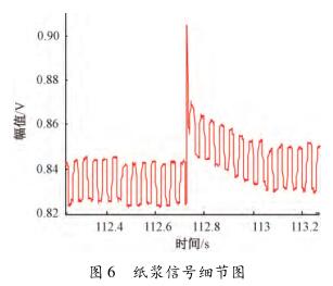 為了進一步研究水煤漿信號的特點,將其與紙漿信號進行對比。通過分析課題組采集的25Hz矩形波勵磁下的紙漿信號發現,在同樣流速下,測量介質為紙漿時,傳感器輸出信號經調理放大后能明顯看到與流量相關的感應電動勢信號,且其漿液干擾僅為數十毫伏,要遠小于水煤漿信號中的漿液干擾,如圖5所示。對圖5所示的紙漿信號進行局部放大,得到如圖6所示的信號。可見,紙漿信號中的漿液干擾持續的時間也遠小于水煤漿信號中的漿液干擾,且頻率較低。