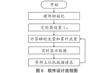 上電后程序?qū)SP的硬件資源進(jìn)行初始化,包括中斷系統(tǒng)、GPIO口、定時(shí)器/計(jì)數(shù)器、通信端口及基本的時(shí)鐘設(shè)置。程序每秒對接收到的脈沖進(jìn)行計(jì)數(shù),其除以儀表系數(shù)后的結(jié)果作為瞬時(shí)流量,同時(shí)在時(shí)間上對瞬時(shí)流量進(jìn)行累積,計(jì)算出兩種流量后,將其實(shí)時(shí)顯示在液晶顯示屏上,同時(shí)將數(shù)據(jù)保存,**等待上位機(jī)電腦對數(shù)據(jù)的讀取。通信采用MODBUS協(xié)議,波特率為9600b/s,無校驗(yàn),8位數(shù)據(jù)位,1位停止位。圖6為微處理器功能設(shè)計(jì)流程圖。