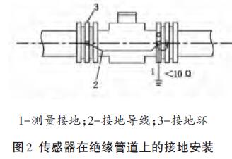 傳感器安裝在塑料管道或內壁有絕緣涂層、襯里的管道上,兩端應安裝接地環(或帶有接地電極的金屬短管),然后用導線連接,使管內流動的介質與大地短路,具有零電位(見圖2)。