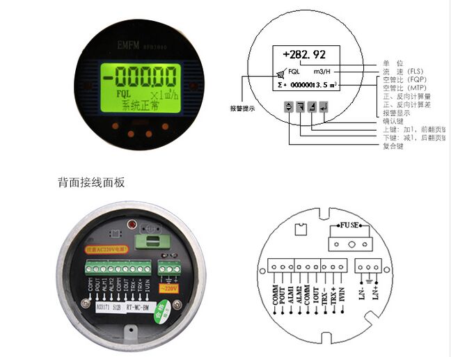 2、操作鍵和顯示按鍵式:4個薄膜按鍵可設定選擇全部參數,也可利用PC機(RS232)對轉換器設定編程;3行LCD寬視角、寬溫、帶背光顯示;*1行顯示流量值;*2行顯示流量單位;*3行顯示流量百分比、正向總量、反向總量、差值總量、報警、流速。