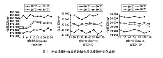 將實驗測得的管道污水處理進出水口流量計在不同溫度及流速下的儀表系數數據整理,特性曲線如圖1所示,3組曲線分別對應DN40, DN80, DN100的3塊管道污水處理進出水口流量計的儀表系數曲線。