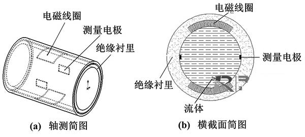電容式工業(yè)污水流量計從根本上解決了電極表面附著、腐蝕、摩擦等問題,其電極與被測流體間有絕緣襯里隔離,或者直接采用絕緣測量管。電極置于測量管外面或鑲嵌于測量管內(nèi)部。嵌人式工業(yè)污水流量計和外貼式工業(yè)污水流量計的結(jié)構(gòu)如圖2所示。