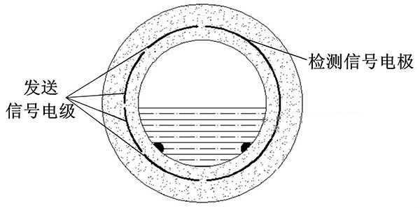 ③利用阻抗或信號衰減研制的非滿管工業(yè)污水流量計。這種結(jié)構(gòu)的非滿管工業(yè)污水流量計是當(dāng)前國內(nèi)研究的方向之一。其結(jié)構(gòu)是流量管底部貼一對信號發(fā)射電極,在流量管中間貼信號接收電極。由于信號在流體中傳播會產(chǎn)生衰減,且傳播時間越長,衰減越多,因此通過信號接收電極接收到的信號衰減量即可得知液面高度;同時該電極還能測量流體切割磁感線產(chǎn)生的電動勢,以此達到測量非滿管流量的目的。阻抗式或信號衰減非滿管工業(yè)污水流量計結(jié)構(gòu)簡圖如圖5所示。