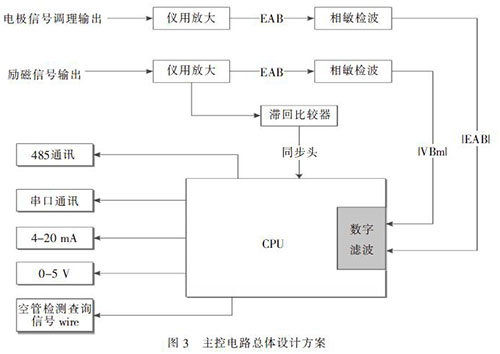 電極檢測(cè)出的微弱感應(yīng)電動(dòng)勢(shì)E, 先經(jīng)前置放大器的放大和噪聲抑制而成為大幅度低阻抗的電壓信號(hào)。此信號(hào)經(jīng)相敏檢波后,給CPU 進(jìn)行數(shù)字濾波、處理和控制,通過利用雙線性變換法將模擬的二階巴特沃斯低通濾波器轉(zhuǎn)換為數(shù)字式濾波器,既簡(jiǎn)化電路設(shè)計(jì),且可靠性高、穩(wěn)定性好。通過編寫軟件CPU 能對(duì)放大器的溫度漂移及零點(diǎn)漂移給予補(bǔ)償, 并在測(cè)量的全量程范圍內(nèi)分10 段對(duì)信號(hào)進(jìn)行非線性修正,使得測(cè)量值更好地?cái)M合真實(shí)數(shù)據(jù)。空管檢測(cè)電路上,CPU 作為從控制器。當(dāng)主控制電路上發(fā)出空管檢測(cè)查詢信號(hào)wire, 從控制器進(jìn)行識(shí)別后接收并判斷出查詢什么信號(hào),然后產(chǎn)生應(yīng)答信號(hào)上傳至主控芯片輸出顯示;當(dāng)檢測(cè)為空管信號(hào)時(shí), 從CPU 發(fā)出的zero 信號(hào)通過控制MOS 管開關(guān)來關(guān)斷流速輸出。在應(yīng)用中,對(duì)于微弱信號(hào)的放大及提取還需注意PCB 板設(shè)計(jì)時(shí)EMI 電磁屏蔽考慮,屏蔽來自空間磁場(chǎng)的干擾、周邊設(shè)備的輻射造成的干擾和板內(nèi)之間的干擾,如數(shù)模分離、強(qiáng)弱電分離等等。