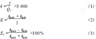 將乙烯流量計在標準水裝置上,分別用頻譜分析和脈沖計數的方法進行標定,流體介質為水未加氣體,采用的標準傳感器為精度等級為0.2級的電磁流量計。在每個流量測量點上的儀表系數用公式(1)計算,然后用式(2)計算得到*終儀表系數K。Ql為被測水的流量值,f為每一個流量點得到的頻率,k為每個測量點得到的儀表系數。kmax、kmin分別為試驗流量范圍內得到的*大與*小的儀表系數。儀表系數的線性度E1用式(3)來計算。