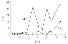 將試驗數據進行處理,得到了乙烯流量計測量誤差隨氣相含率變化的情況,如圖5所示。其中δs為譜分析方法的測量誤差,δc為脈沖計數方法的測量誤差。乙烯流量計的測量誤差用式(4)來計算。其中Qs為裝置中標準表測量出的管道總流量,Qt為試驗管段中乙烯流量計的測量值。將譜分析和脈沖計數得到的頻率值和儀表系數分別代入式(5)計算Qt值。從圖中可以看出氣相含率的增加兩種測量方法得到的誤差并不相同。當含氣率不高時,0<β<6%,譜分析法的平均誤差為1.226%,*大誤差為2.687%,脈沖計數法的平均誤差為1.583%,*大誤差為2.898%,因此譜分析法與脈沖計數法的測量誤差區別不大,譜分析沒有明顯的優勢;在氣相含率進一步增加時,6%<β<14%,譜分析法的平均誤差為3.975%,*大誤差為14.058%,脈沖計數法的平均誤差為20.053%,*大誤差為33.130%,脈沖計數的方法得到的測量誤差遠大于譜分析方法。
