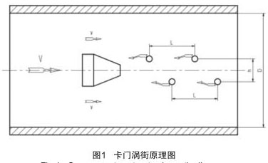插入式煙氣流量計實現流量測量的理論基礎是流體力學中**的“卡門渦街”原理,在流動的流體中裝置一個非線性三角柱形體,即渦旋發(fā)生體,如圖 1 所示。當流體沿渦旋發(fā)生體繞流時,會在渦旋發(fā)生體下游產生兩列不對稱,但有規(guī)律交替地分離釋放出一系列漩渦束,只有當兩渦漩列之間的距離 h 和同列的兩渦漩之間的距離 L 之比滿足 h/L=0.281 時,所產生的渦街才是穩(wěn)定的。