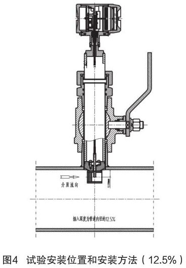 根據中華人民共和國機械行業(yè)標準:JB/T9249-2015《煙氣流量計》進行插入式煙氣流量計的研制與設計。在試驗過程中,因為理論研究不充分,再加上經驗不足,采用插入深度是按照以往其它產品(插入式電磁流量計)的經驗,以插入深度為現場管道內徑的 12.5% 進行試驗,其對介質流量的檢測值與同種規(guī)格管道法蘭式結構的煙氣流量計進行比較,偏差值較大、儀表準確度無法滿足設計要求。試驗安裝位置和安裝方法如圖 4 所示。