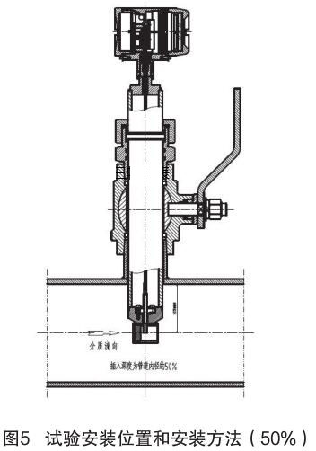 對插入式煙氣流量計和插入式電磁流量計的結構原理進行分析,插入式電磁流量計的信號采集點在標校管道內12.5% 為宜,因它屬電磁類流量計,而煙氣流量計是根據“卡門渦街”原理進行測量管道內流量,根據標校管道內層流和湍流的分析,以及插入式煙氣流量計獨特的探頭結構形式,確定插入式煙氣流量計的插入深度為標校管道內 50%,試驗安裝位置和安裝方法如圖 5 所示。