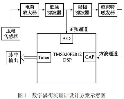 本文設(shè)計的基于 TMS320F2812 DSP 的數(shù)字二氧化碳流量計的信號處理系統(tǒng)由前置放大電路和數(shù)字信號處理電路兩部分組成。本文選用的前置放大電路即為目前被廣泛應(yīng)用的普通二氧化碳流量計的前置放大電路,主要由電荷放大電路、低通濾波電路、限幅濾波電路和施密特觸發(fā)電路組成; 對于經(jīng)壓電傳感器測得的渦街信號采用了頻域分析和時域分析相結(jié)合的方式,即由前置放大電路和數(shù)字信號處理電路相配合。時域分析通道利用 DSP 事件管理器的捕獲模塊,對前置放大電路輸出的方波進(jìn)行頻率計算,然后再由 DSP 事件管理器通用定時器的比較輸出模塊進(jìn)行脈沖輸出。頻域分析通道即 DSP對低通濾波電路輸出的疊加了許多噪聲的正弦信號進(jìn)行 A/D 采樣,再利用 DSP 對 A/D 采樣的結(jié)果進(jìn)行頻譜分析,從而得出此時渦街信號的頻率,*后由 DSP 通用定時器的比較輸出模塊進(jìn)行脈沖輸出。系統(tǒng)設(shè)計方案示意圖如圖 1 所示。