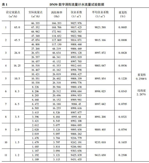 將本文實(shí)現(xiàn)的數(shù)字二氧化碳流量計在上述 50mm 口 徑( 簡稱 DN50) 的水流量試驗裝置上進(jìn)行試驗。先在其正常流量范圍內(nèi)進(jìn)行試驗,流量從大到小逐漸降低,之后不斷探求其所能測量的*小流量。每個流量點(diǎn)試驗三次,計算其重復(fù)性、平均儀表系數(shù)和線性度。水流量試驗數(shù)據(jù)如表 1 所示。