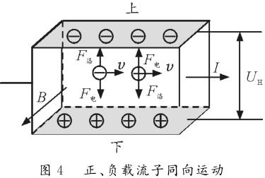 情形2:正、負載流子反向運動。如圖3所示,長方體玻璃水槽中盛有NaCl的水溶液,水槽左、右側壁內側各裝一導體片,在溶液中通入水平向右的電流,勻強磁場B垂直紙面向外。NaCl溶液中既有正離子,又有負離子,根據左手定則可判斷正離子受到向下的洛倫茲力,故向下運動并堆積。同理,負離子也受到指向下的洛倫茲力,也向下運動并堆積。由于正負離子均向下側面堆積,故上下兩側面的電勢均為零,但下側面處離子濃度大于上側面離子濃度。
