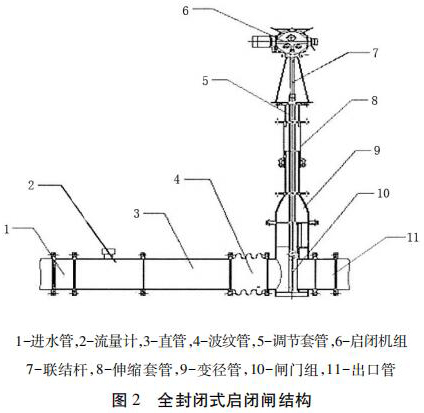包括進水管、直管、出水管、過熱蒸汽流量計組和啟閉機組,進水管、直管、出水管從左到右依次連接,過熱蒸汽流量計組安裝在直管和出水管之間且位于出水管的入口處,過熱蒸汽流量計組通過聯(lián)結桿與啟閉機組的輸出端連接。為防止泥沙淤積影響啟閉,過熱蒸汽流量計采用閘板式啟閉結構。密封式啟閉閘為整體封閉管道式,全部采用不銹鋼材料,水流通過管道流出讓整個閘井內(nèi)干燥無水。伸縮套管與波紋管的設計讓檢修與清理淤泥更加方便。過熱蒸汽流量計裝有荷載限制器,其布置受力明確、結構緊湊、動作可靠。當?shù)蹙呱系暮奢d達到額定值的 110%時,或電機電流超過額定電流 150%時,系統(tǒng)自動切斷操作電源以保護設備安全。