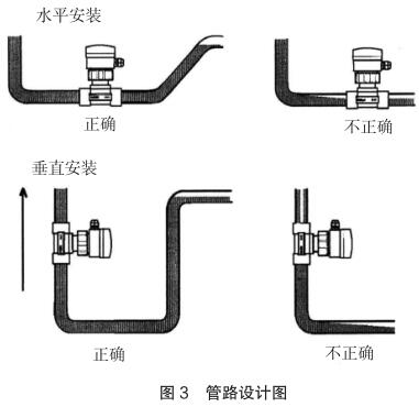 現(xiàn)場(chǎng)安裝時(shí)應(yīng)注意遠(yuǎn)離可能對(duì)其產(chǎn)生干擾的大型設(shè)備,防止長(zhǎng)期的熱輻射和其他如磁場(chǎng)直射等環(huán)境影響。為確保高測(cè)量精度和較好的零點(diǎn)穩(wěn)定性,進(jìn)行校正前,高壓電磁流量計(jì)應(yīng)裝入工藝介質(zhì)中至少 24 小時(shí)電極鈍化。安裝的管路設(shè)計(jì)應(yīng)確保管道始終充滿流體,防止測(cè)量誤差,管路設(shè)計(jì)圖見(jiàn)圖 3。