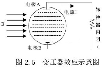 從上圖 2.5 中可以觀察到兩個電極、勵磁線圈、轉換器內阻之間形成了一個閉合回路,將此回路稱之為初級繞組,從理論上進行分析,磁力線 B 應當平行于勵磁線圈所產生的磁感應線,但在實際的應用過程中由于工藝差異,因此無法達到理想狀態,會產生磁力線穿過勵磁線圈磁感應線的情況,此時將會產生相應的感應電動勢,將此部分感應電動勢稱為變壓器效應。此效應同樣滿足于楞次定律,利用楞次定律進行計算可得如下電動勢: