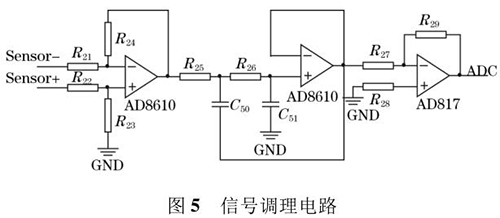 如圖4 所示,信號調理電路由前置放大電路、濾波電路以及二次放大電路組成。其中前置放大電路主要是由 AD8610 組成的差分放大電路構成,其主要是去除信號中的共模干擾并且進行*一次前置放大,前置放大電路的放大倍數為 15。由于有效信號的幅值很小,經過前置放大電路后信號中還存在很多高頻雜波,這些雜波會影響對后級信號的處理,因此還需要對前置放大電路輸出的信號進行低通濾波和二次放大。系統選用二階有源低通濾波電路濾除信號中的高頻干擾,低通濾波的截止頻率設定在 6 kHz 左右,選用 AD817 組成的二次放大電路對濾波電路輸出的信號進行二次放大,將信號調理電路輸出的信號調整在 0~5 V 之間,*終利用 DSP 內部的 AD 轉換器對此信號進行模數轉換得出傳感器線圈輸出的感應電動勢,從而根據相關的公式計算得出管道中液體的流量。具體電路圖如圖 5 所示。