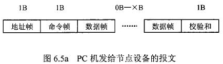 在測水流量計等節點設備和C機通信的過程中,由地址幀、命令幀、數據幀、校驗和可組成各種功能不同的報文。由于采用主從工作方式來實現通信,測水流量計等節點設備僅能接收并執行PC機發送來的控制命令,而不能發送命令給PC機。因此,由PC機發往流量計等節點設備的報文一般包括一個地址幀,一個命令幀,若干個數據幀和一個校驗和,其報文格式圖.6a5所示;而由流量計等節點設備發往PC機的報文一般包括一個地址幀,若干個數據幀和一個校驗和,其報文格式如圖6.5b所示。