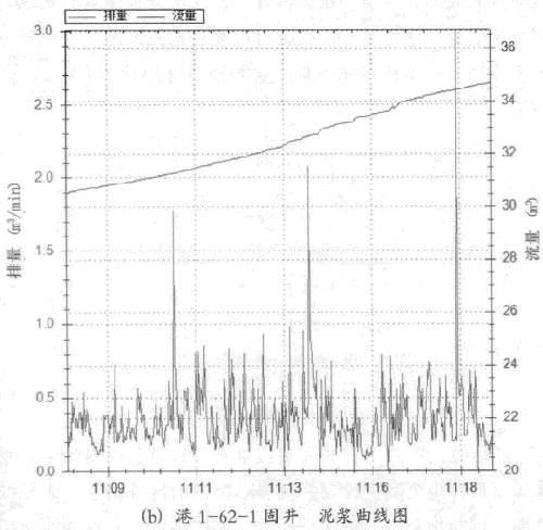 在固井全程的曲線中,也可以發(fā)現(xiàn)開始固井的時(shí)候.泥漿排量雜波較小,究其原因是剛開始固并時(shí),泥漿管線剛泄壓,管線中還是充滿了液體,雖然振動(dòng)強(qiáng)度雷同.但是葉片有阻尼,振幅較小.對(duì)其影響也較小。例如曲線圖的11;03: 00-11: 03: 53之間的泥漿排量沒有雜波。在港1-62-1固井過程中,水泥漿打了413澎,結(jié)果本應(yīng)該是0的泥漿,卻走數(shù)了23.0 m',其影響可謂巨大.并非通過普通的濾波或切除所能排除,必須執(zhí)行一個(gè)特殊算法。
