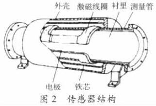 液體流量計由流量傳感器和轉換器兩部分組成。傳感器典型結構示意如圖2,測量管上下裝有激磁線圈,通激磁電流后產生磁場穿過測量管,一對電極裝在測量管內壁與液體相接觸,引出感應電勢,送到轉換器。激磁電流則由轉換器提供。