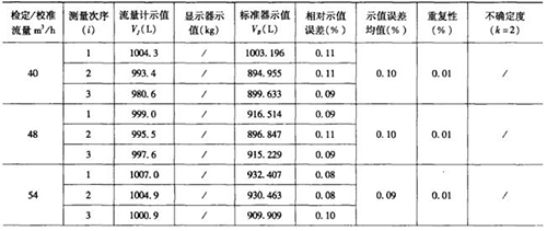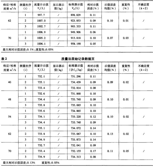 表1是用容積法現場檢測流量計后,電腦自動生成的原始記錄數據頁部分,表2是用質量法現場檢測流量計后,電腦自動生成的原始記錄數據頁部分。