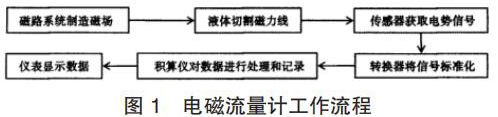 智能渦輪流量計的產生主要是基于法拉*電磁感應定律。在智能渦輪流量計的應用中,磁路系統會在流量計運行過程中逐步出現直流磁場與交流磁場,該磁場的產生為后期的測量提供了良好的前提條件,營造了測量所需的磁場環境,因此,在智能渦輪流量計應用時,一旦被測液體在導管中經過該磁場環境時,必然會產生一定的切割磁力線運動,在這種情況下,電極傳感器就會發揮其作用,將導管內的流量轉換為感應電勢信號,隨后此轉換形成的信號逐步被傳遞給轉換器。而轉換器更是可以將所獲得的流量信號等加以處理,通過分析、對比等,轉換器會將該信號變為標準信號,隨后將該信號輸出給積算儀,進一步進行信號的處理,這些處理以后的信號*終會在智能渦輪流量計的儀表中顯示,呈現*終的流量測量結果,其基本的流程如圖 1 所示。