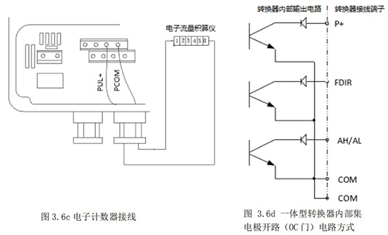 頻率(脈沖)、上下限報警、流向標(biāo)示等輸出均為集電極開路的電平輸出信號。