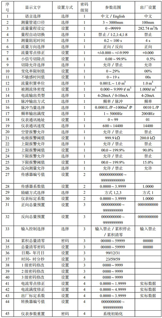 LDG 共有 45 個(gè)菜單項(xiàng),使用儀表時(shí),用戶應(yīng)根據(jù)具體情況設(shè)置或選擇各參數(shù)。LDG 菜單一覽表如下: