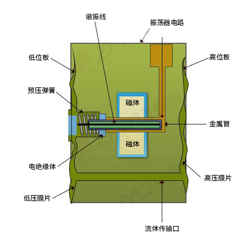 由磁場驅(qū)動(dòng)的振蕩器電路會(huì)導(dǎo)致導(dǎo)線以其共振頻率振蕩。導(dǎo)線的一側(cè)牢固地固定到靜態(tài)部件,而另一側(cè)則連接到膜片。彈簧使電線預(yù)緊。由于過程壓力對(duì)隔膜的影響,金屬絲將在壓力升高時(shí)拉伸,而在壓力降低時(shí)收縮。共振頻率將相應(yīng)地增加或減少。數(shù)字計(jì)數(shù)器測(cè)量諧振頻率的變化,并將其信號(hào)傳遞給微芯片,該微芯片還處理線性化補(bǔ)償和溫度補(bǔ)償。