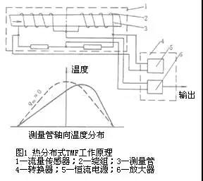 熱分布式tmf的工作原理如圖1所示,薄壁測量管3外壁繞著兩組兼作加熱器和檢測元件的繞組2,組成惠斯登電橋,由恒流電源5供給恒定熱量,通過線圈絕緣層、管壁、流體邊界層傳導熱量給管內流體。邊界層內熱的傳遞可以看作熱傳導方式實現的。在流量為零時,測量管上的溫度分布如圖下部虛線所示,相對于測量管中心的上下游是對稱的,由線圈和電阻組成的電橋處于平衡狀態;當流體流動時,流體將上游的部分熱量帶給下游,導致溫度分布變化如實線所示,由電橋測出兩組線圈電阻值的變化,求得兩組線圈平均溫度差δt。便可按下式導出質量流量qm,即