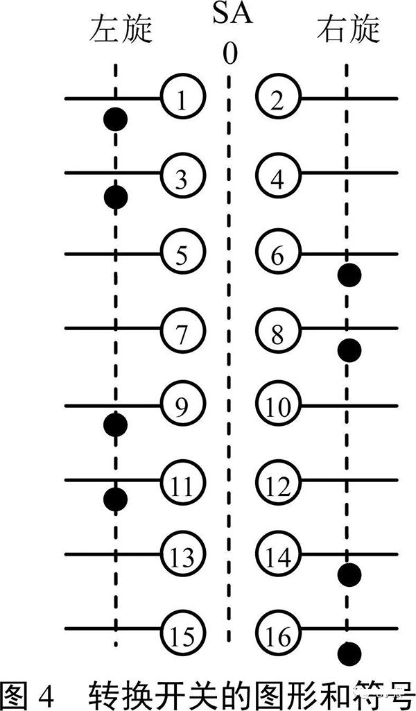 圖4是一款轉(zhuǎn)換開關(guān)的圖形和符號,表1是它在左旋和右旋兩個部位時8個開關(guān)對應的通斷情況。
