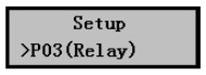 1) 在分體式超聲波液位計正常工作時按擊Mode鍵進入參數設置菜單后按擊▼鍵選擇到P03(Relay)繼電器設置菜單,如右圖所示。