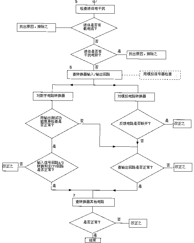 先在管系和流量傳感器內(nèi)通水,靜止無流動狀態(tài)下將轉(zhuǎn)換器兩信號端子和功能地或保護(hù)地端子短路,觀察轉(zhuǎn)換器輸出信號足否到零。若能到零,則可初步判斷故障在轉(zhuǎn)換之前而不在轉(zhuǎn)換器本身及后位儀表,下一步可先重點(diǎn)檢查連接電纜和傳感器(即流程圖*2項(xiàng));若不能到零,則檢查重心應(yīng)在轉(zhuǎn)換器和后位儀表(即流程圖*3、4、6、7項(xiàng))。