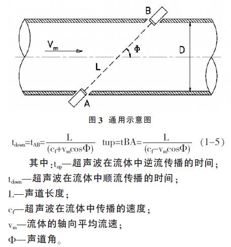 2、超聲流量計以測量超聲波在流動介質中傳播的時間與流量的關系為原理。通常認為超聲波在流體中的實際傳播速度是由介質靜止狀態下超聲波的傳播速度cf和流體軸向平均流速vm在超聲波傳播方向上的分量組成。如圖,順流和逆流傳播時間與各量之間的關系是