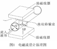 如圖1所示,某一時刻由一對勵某一時刻由一對勵磁線圈產生的磁感磁線圈產生的磁感應強度B,方向向上,流入液體的速上,流入液體的速度為v,管的直徑管為D,兩極的距離為Le,兩極間電動勢,兩極間電動勢ε正比于磁感應強度正比于磁感應強度B、流速v和兩極間的距離Le,即: