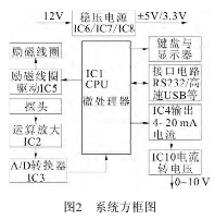 裝置采用模塊(裝置采用模塊(STM32F217STM32F217)來控制電磁流量)來控制化工污水流量計選型的工作,包括產生勵磁脈沖方波信號、接收從探頭計的工作,包括產生勵磁脈沖方波信號、接收從探頭送來的反映流量大小的微弱電信號、輸出送來的反映流量大小的微弱電信號、輸出4~20mA電流信號供指示儀表用,模塊附帶有各類接口電路電流信號供指示儀表用,模塊附帶有各類接口電路(RS232、高速USB接口等)。裝置包括:接口等)。裝置包括:IC1單片機、IC2前置放大器、IC3A/DIC3A/D轉換器、IC4電壓轉電流模塊、IC5勵磁線圈的驅動模磁線圈的驅動模塊電路、IC6電壓轉換模塊,以壓轉換模塊,以及USB快速接口電路、IC9芯片與周圍元件組片與周圍元件組成的RS232接口等電路。方框口等電路。方框圖如圖2所示。
